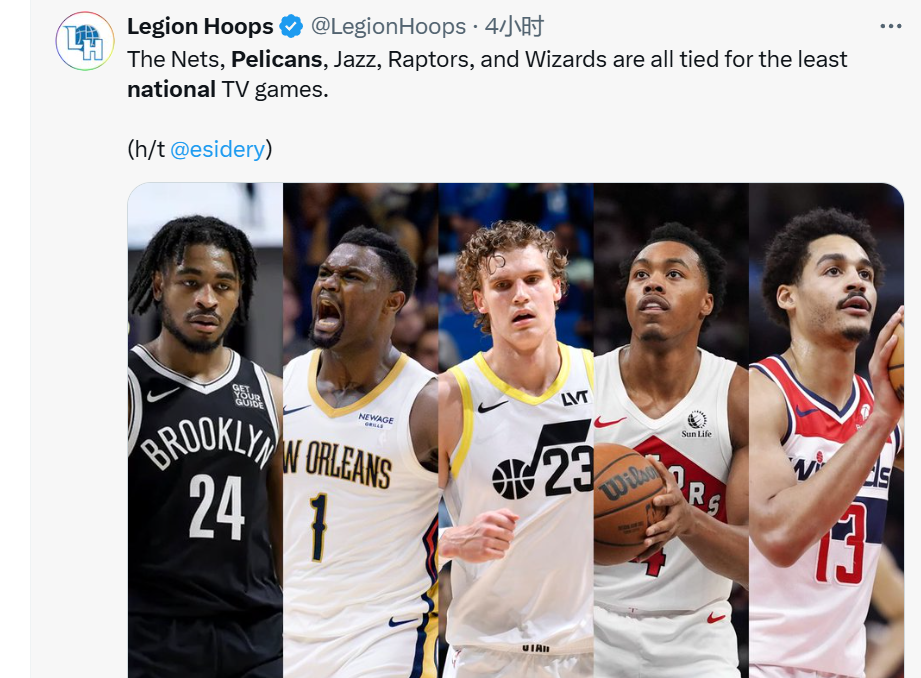 有人欢喜则有人愁,篮网、鹈鹕、爵士、猛龙、奇才这5队全美直播只有2场并列全联盟最低。